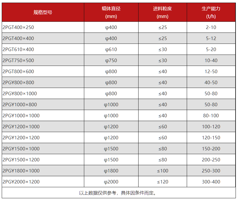 2PGT750×500 輥體直徑:750mm,輥面寬度:500mm,進(jìn)料粒度:≤30mm,生產(chǎn)能力:10-40t/h,電機(jī)功率:2x18.5kw